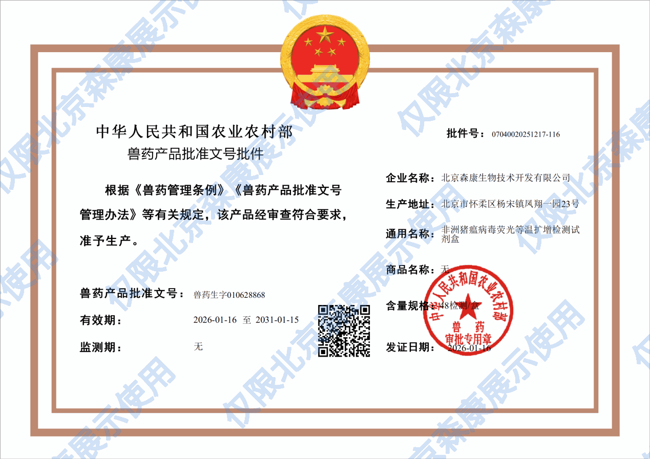 非洲猪瘟病毒荧光等温扩增检测试剂盒新兽药注册证书