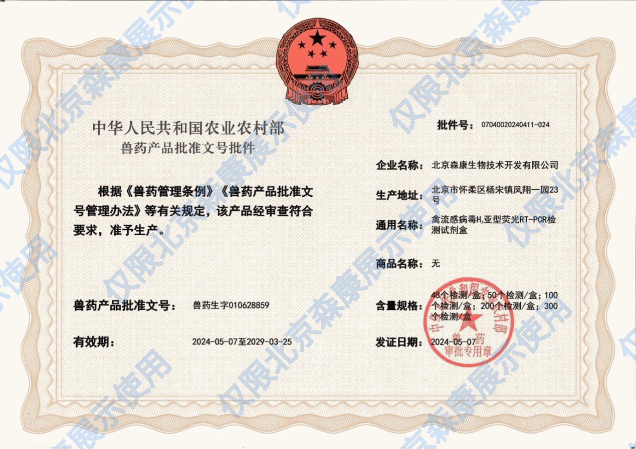禽流感病毒H7亚型荧光RT-PCR检测试剂盒新兽药注册证书
